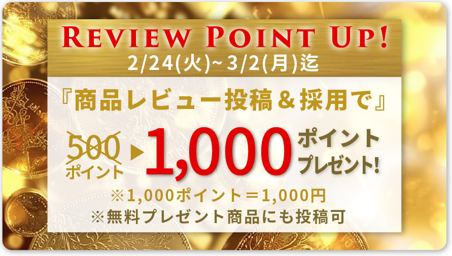 お客様からのご意見をより多く反映させて頂くため、レビュー投稿で付与させて頂くポイントを、期間限定で、今だけ500ptから1,000ptに大幅アップいたしました!