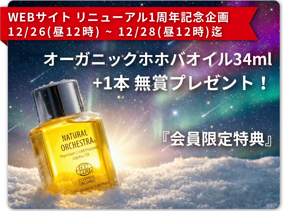 ここで、お礼と感謝の意を込め、会員限定特典として、「オーガニックホホバオイル34ml(税込¥3,080)を+1本、無料プレゼントさせて頂きます!」